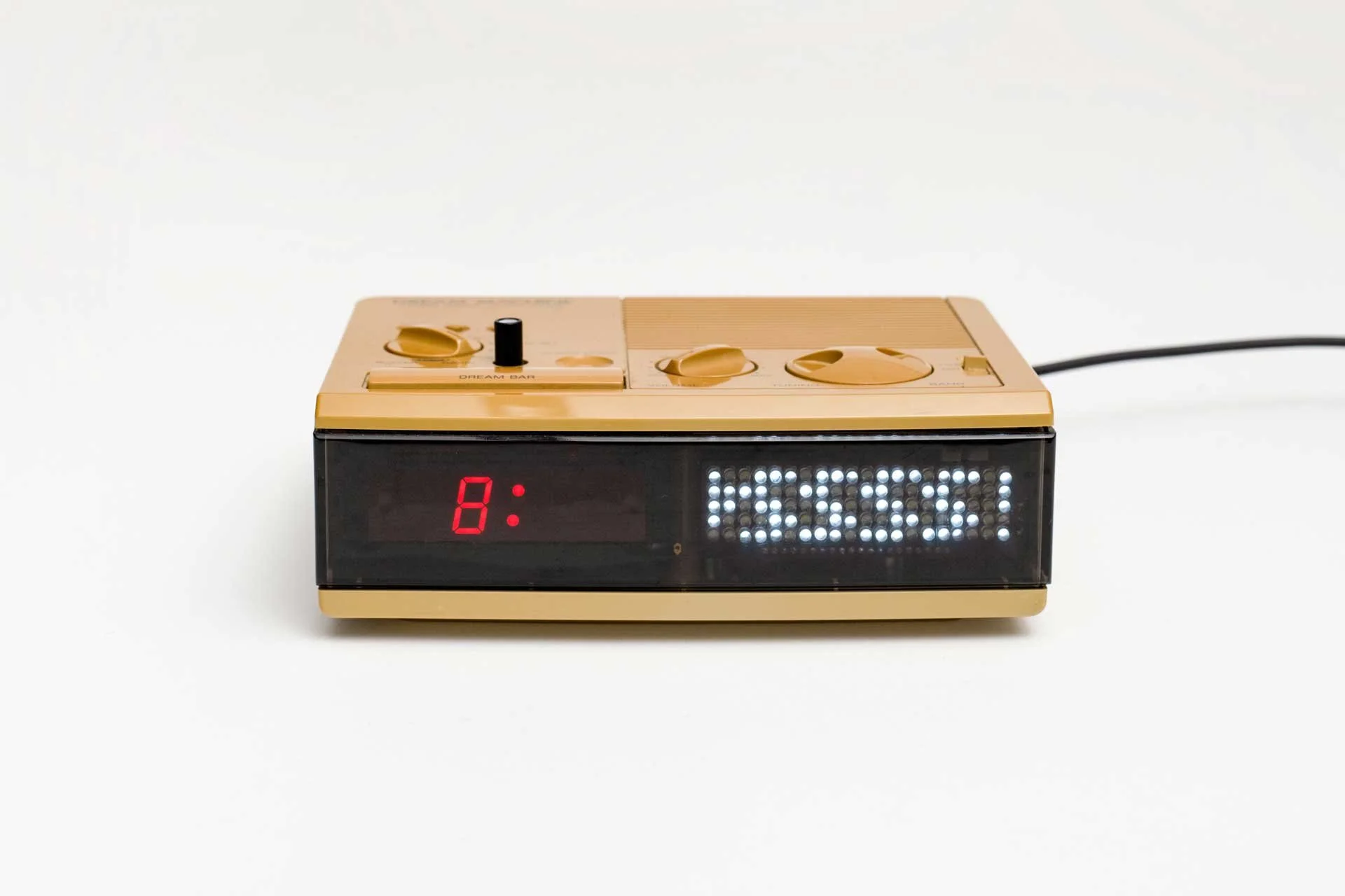 The repaired object tells the time again; and also recounts 11 stories written by the owners about their time overseas. A new story is triggered with each press of the snooze button, rendered through scrolling text on a bespoke LED panel, and to the tune of white noise generated by the refurbished radio speakers.