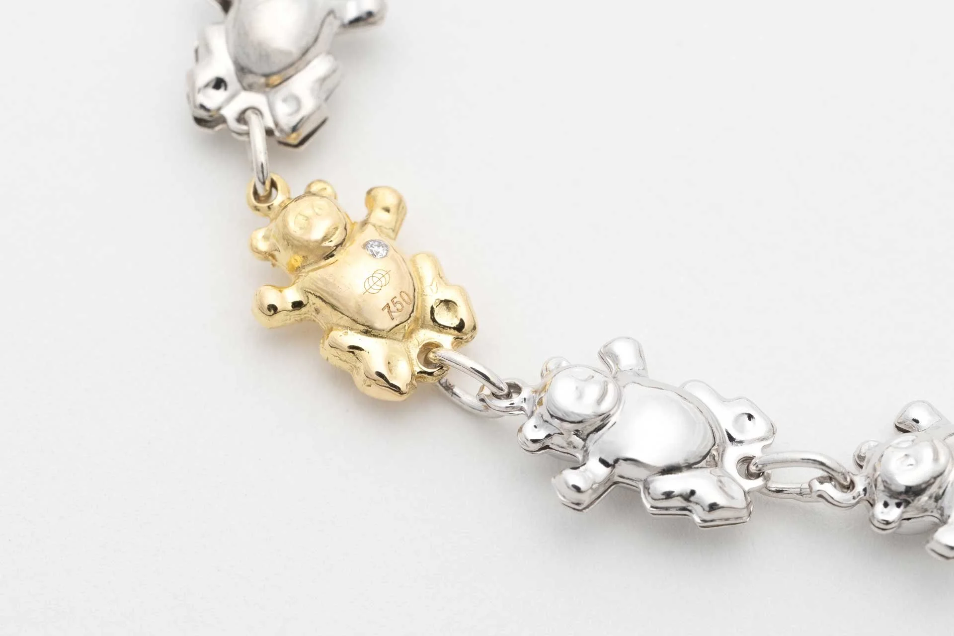 We wanted to remember what was broken, and celebrate its subsequent repair. To replace the damaged link in a manner faithful to the original, a rubber mould of the teddy bear was made. But instead of casting it in the original 925 Silver, the new one is in 18K Yellow Gold. The clear difference in colour and material alludes to the story that lies behind this piece. Gold emphasises the preciousness of this bracelet, while the diamond set at the heart of the bear symbolises what is truly important.
